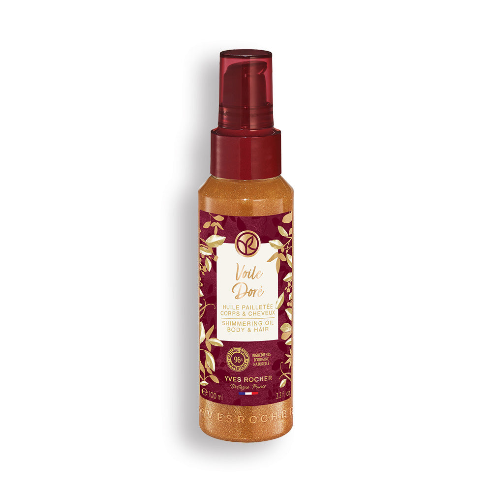 Keha- ja juukseõli särava efektiga Voile Doré, piiratud väljaandes, näib muutvat nahka ja juukseid, ümbritsedes neid magusa-vürtsikate nootidega.