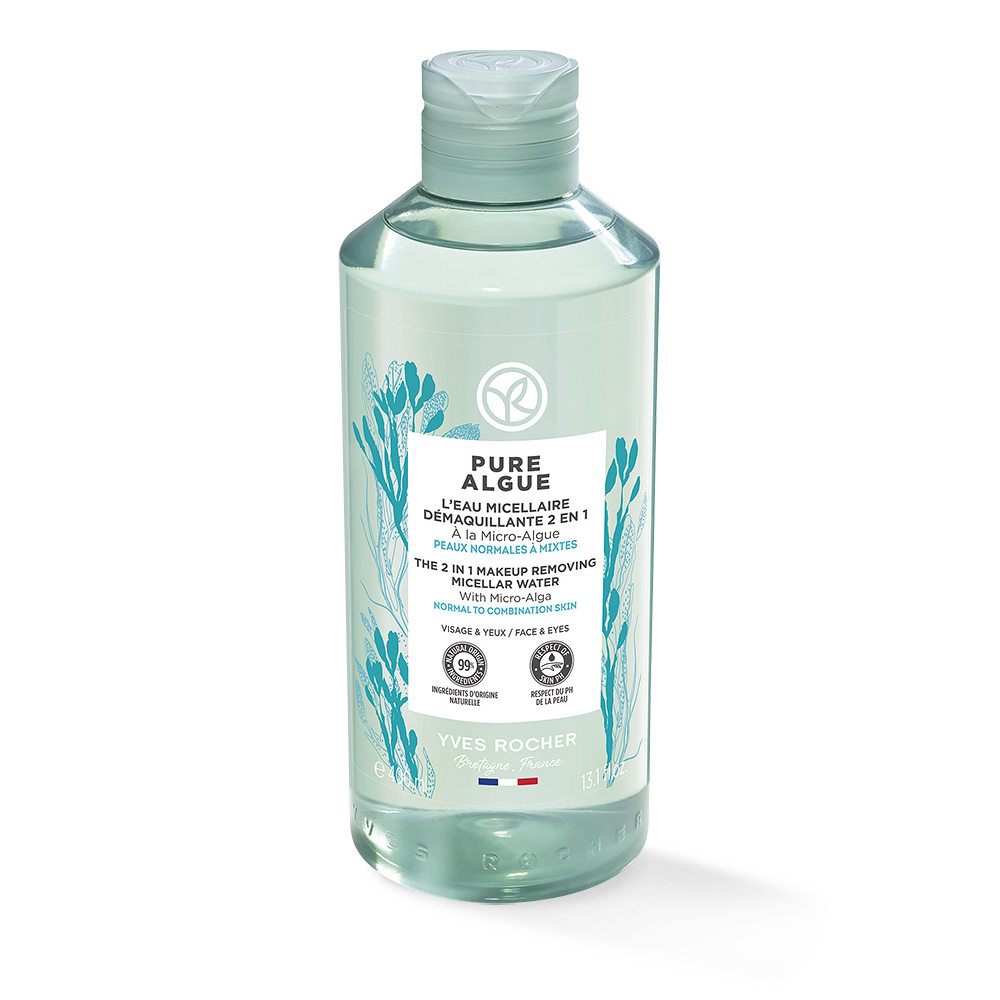 Mitsellaarvesi Meigi Eemaldamiseks 2-in-1 puhastab naha mustusest ja eemaldab ka kõige tugevama meigi jättes naha täiuslikult puhtaks, niisutatuks ja säravaks. Koostisesse kuuluvd Mikrovetikad Tetraselmis, need on kasvatatud vastavalt agroökoloogia reeglitele Bretagne'i ranniku lähedal Prantsusmaal ning on võimelised rikastada nahka hapnikuga*.
