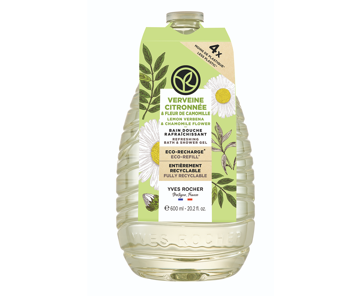 600 ml mahutavusega vahetatav ökopakend sisaldab 4 korda vähem plastikut kui 400 ml dušigeeli pudel**. Pakend on valmistatud vähemalt 90% ulatuses rannikult kogutud ja ümbertöödeldud plastist ning on täielikult ringlussevõetav.