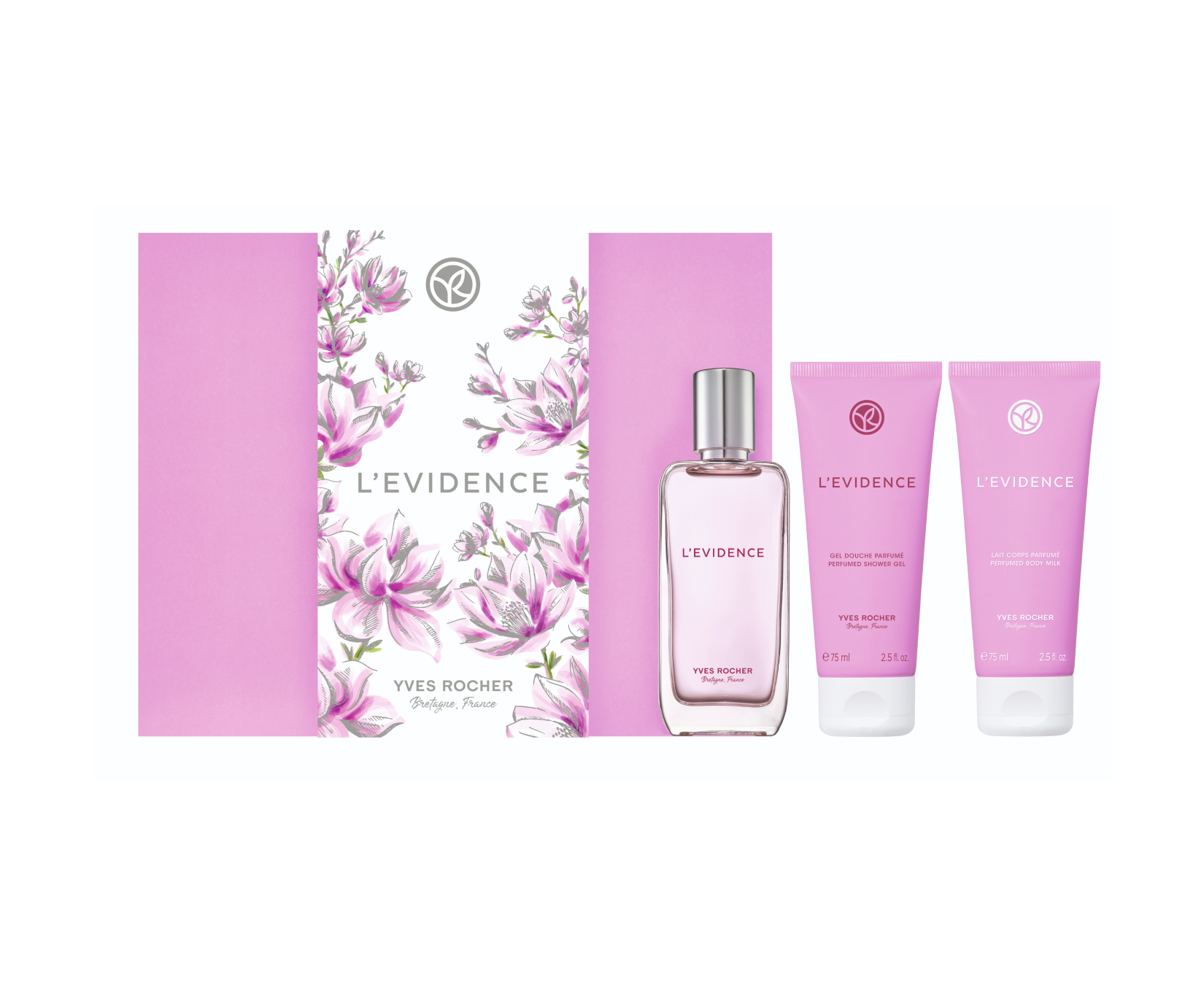 Avastage L'Evidence'i aroom komplektis, mis on pakitud elegantsesse disaini. Parfüüm, parfümeeritud kehapiim ja dušigeel - stiilses pakendis on ideaalne kingitus – justkui loodud jõulupuu alla!