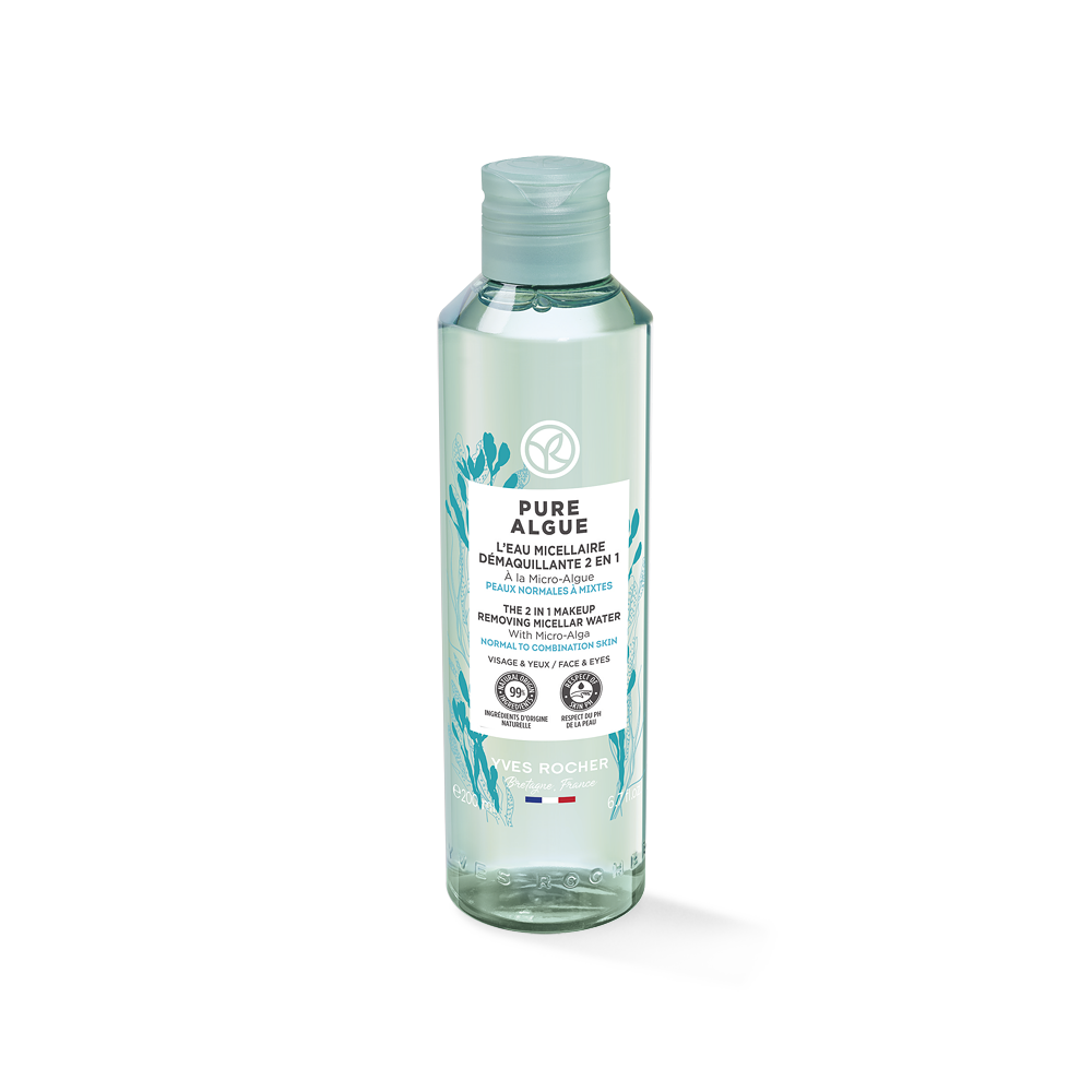 Mitsellaarvesi Meigi Eemaldamiseks 2-in-1 puhastab naha mustusest ja eemaldab ka kõige tugevama meigi jättes naha täiuslikult puhtaks, niisutatuks ja säravaks. Koostisesse kuuluvd Mikrovetikad Tetraselmis, need on kasvatatud vastavalt agroökoloogia reeglitele Bretagne'i ranniku lähedal Prantsusmaal ning on võimelised rikastada nahka hapnikuga*.